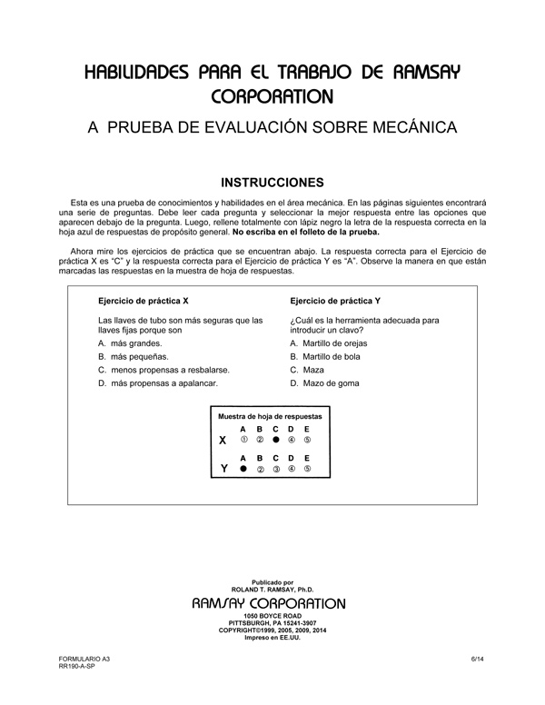 Ramsay Corporation's C, B, and A Mechanic Evaluation tests are for use in selecting manufacturing or processing maintenance candidates who have knowledge in mechanical and electrical maintenance. NOTE: Each level progresses in difficulty, with A Mechanic Evaluation being the most advanced.