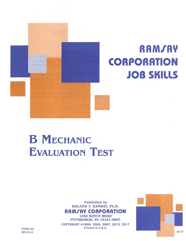 Ramsay Corporation's C, B, and A Mechanic Evaluation tests are for use in selecting manufacturing or processing maintenance candidates who have knowledge in mechanical and electrical maintenance. NOTE: Each level progresses in difficulty, with A Mechanic Evaluation being the most advanced.