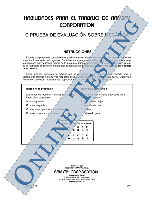 | C Mechanic Evaluation - Form A5 (Spanish) | Paper Test | Spanish | RR192-A-SP |