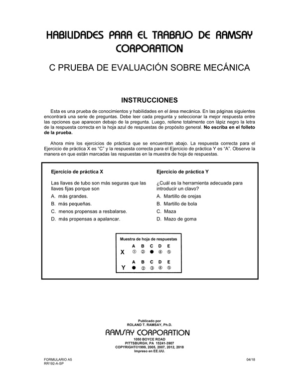 | C Mechanic Evaluation - Form A5 (Spanish, Online) | Online Test | Spanish | OL192-A-SP |