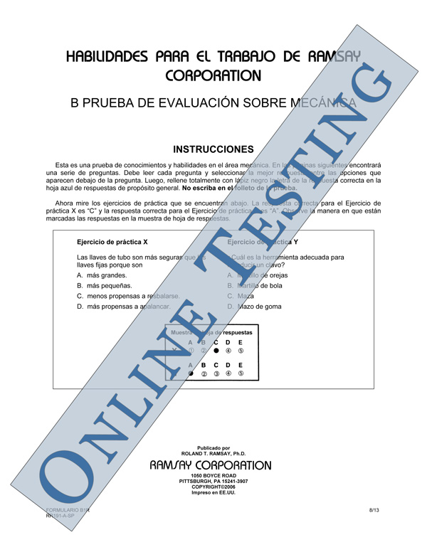 Ramsay Corporation's C, B, and A Mechanic Evaluation tests are for use in selecting manufacturing or processing maintenance candidates who have knowledge in mechanical and electrical maintenance. NOTE: Each level progresses in difficulty, with A Mechanic Evaluation being the most advanced.