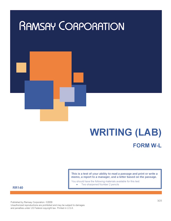 The Ramsay Corporation Job Skills Writing Test Form W consists of three short writing samples. Each sample requires the test-taker to print or write a memo, report to a manager, or a letter. This version is geared towards Laboratory settings.